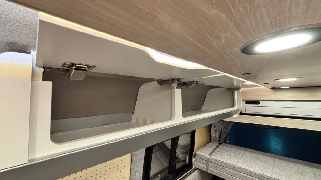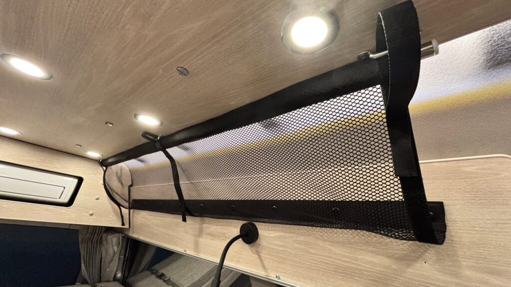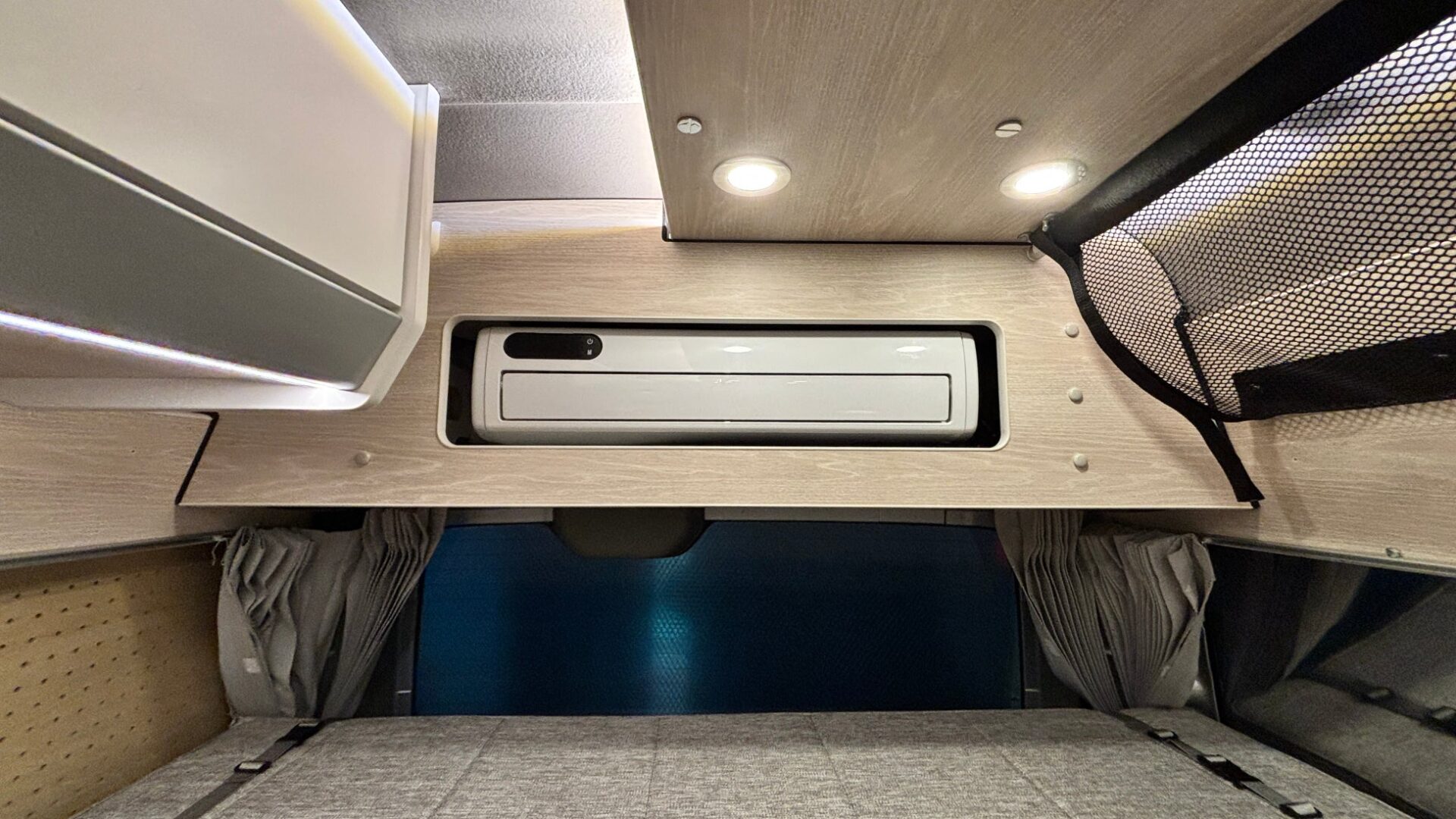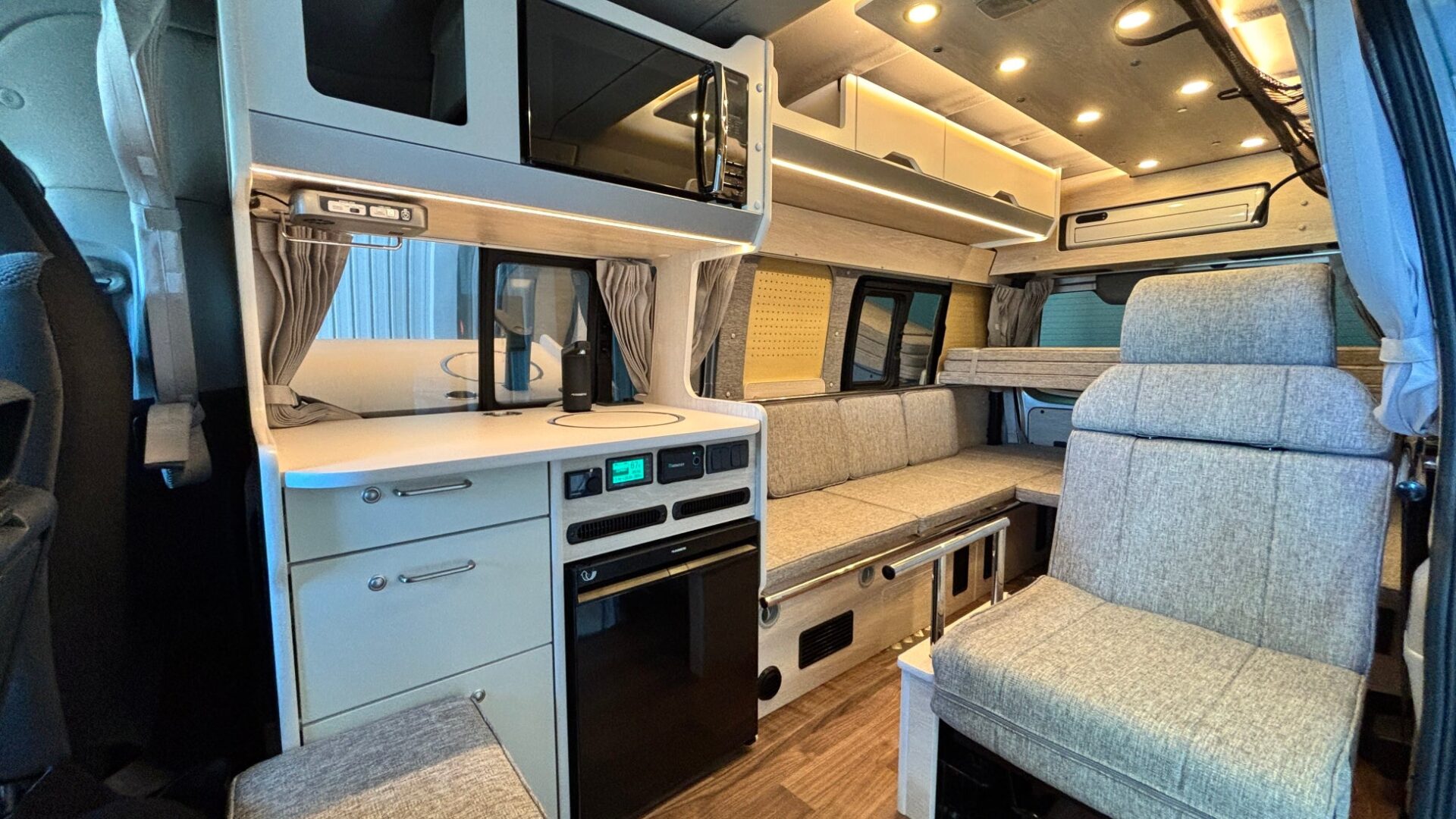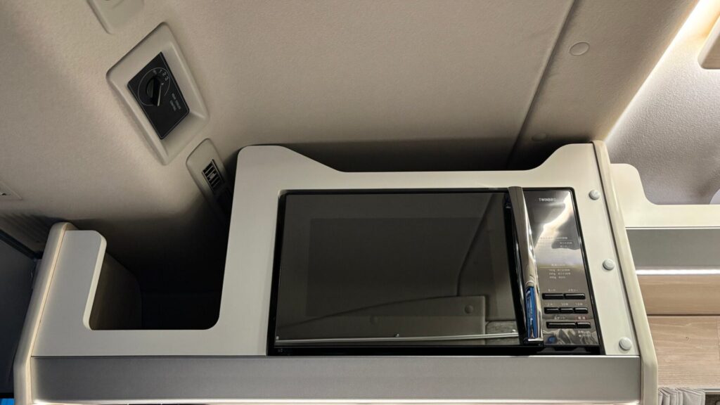 シンク、冷蔵庫、電子レンジが一列に配置されたギャレーは、限られたスペースを効率的に使う設計。ポータブルウォータータップは車外でも使えるマグネット式で、洗顔やアウトドア調理にも重宝します。さらに、天井の間接照明が車内を優しく照らし、夜のくつろぎ時間を演出します。