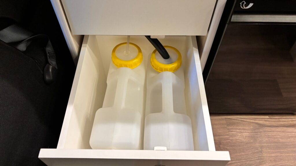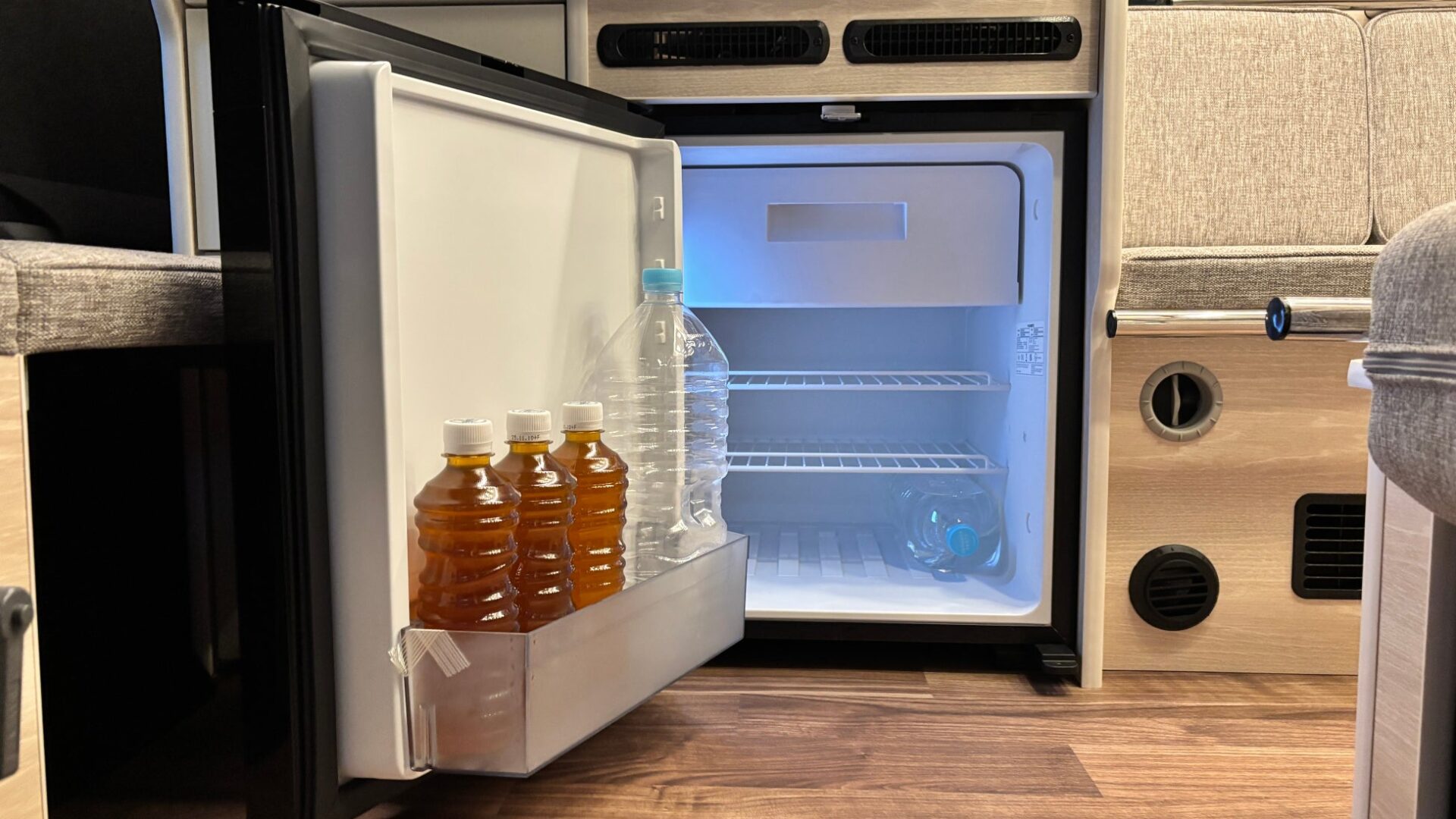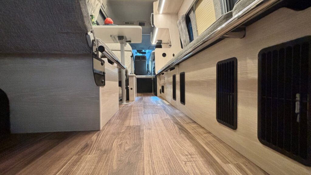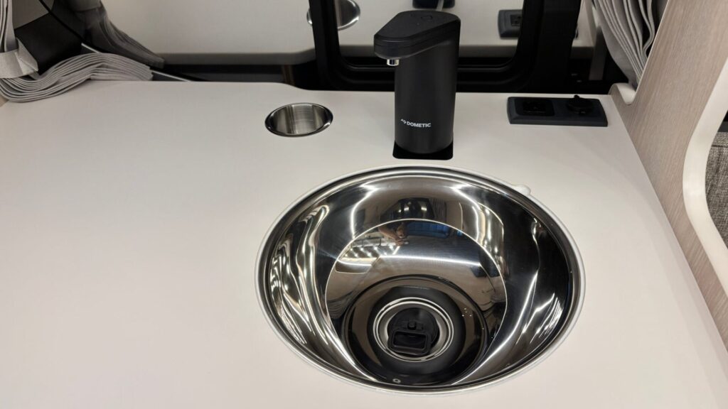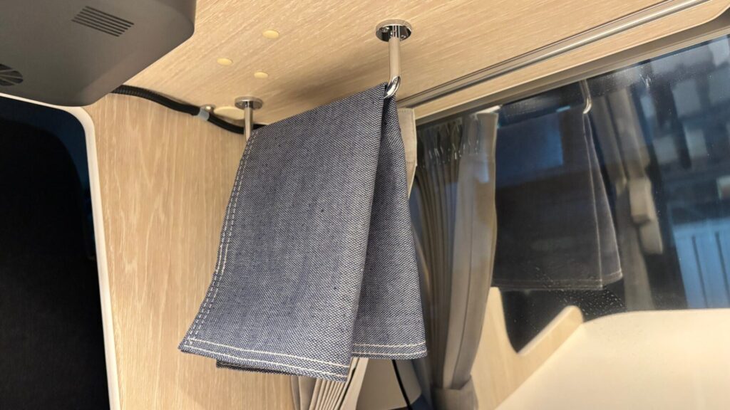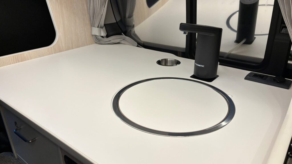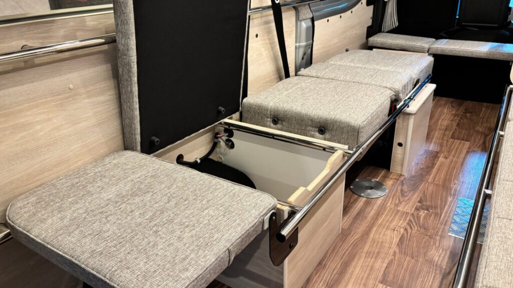 シンク、冷蔵庫、電子レンジが一列に配置されたギャレーは、限られたスペースを効率的に使う設計。ポータブルウォータータップは車外でも使えるマグネット式で、洗顔やアウトドア調理にも重宝します。さらに、天井の間接照明が車内を優しく照らし、夜のくつろぎ時間を演出します。