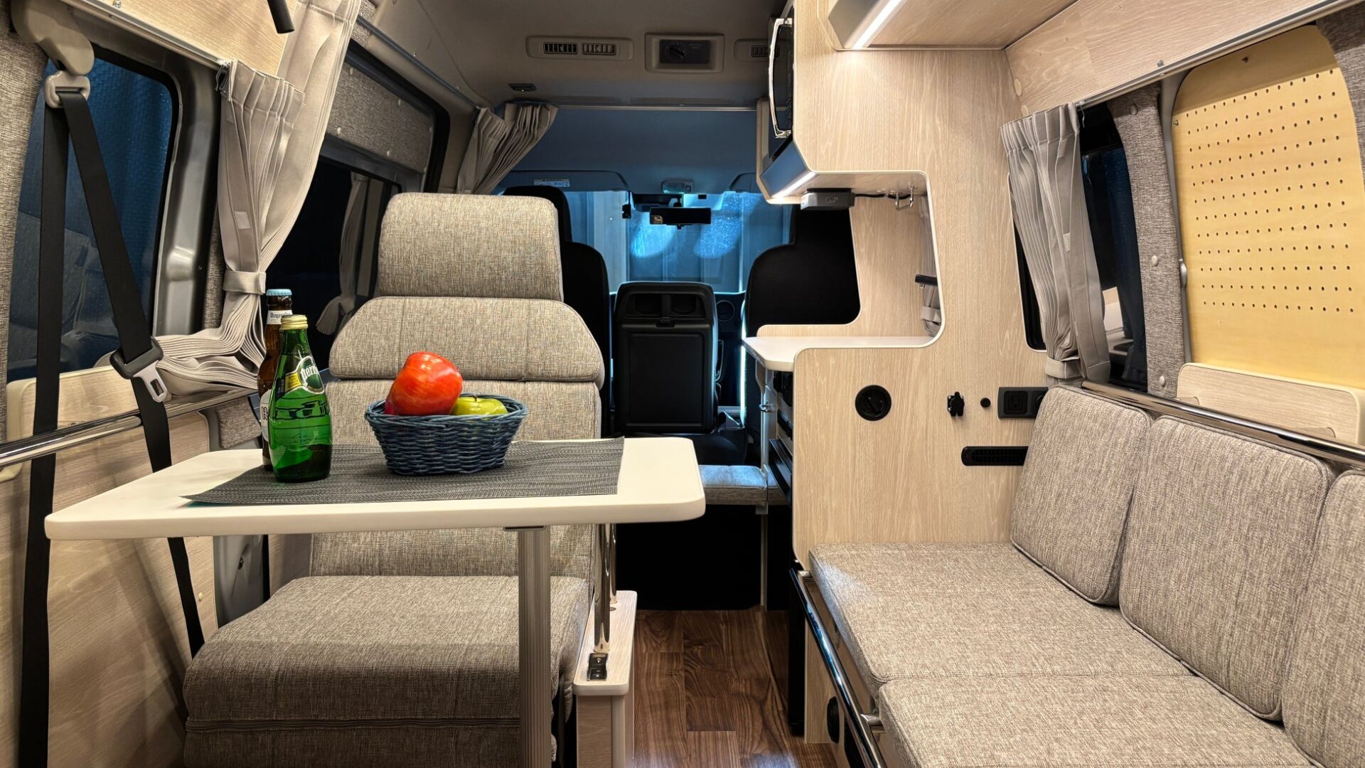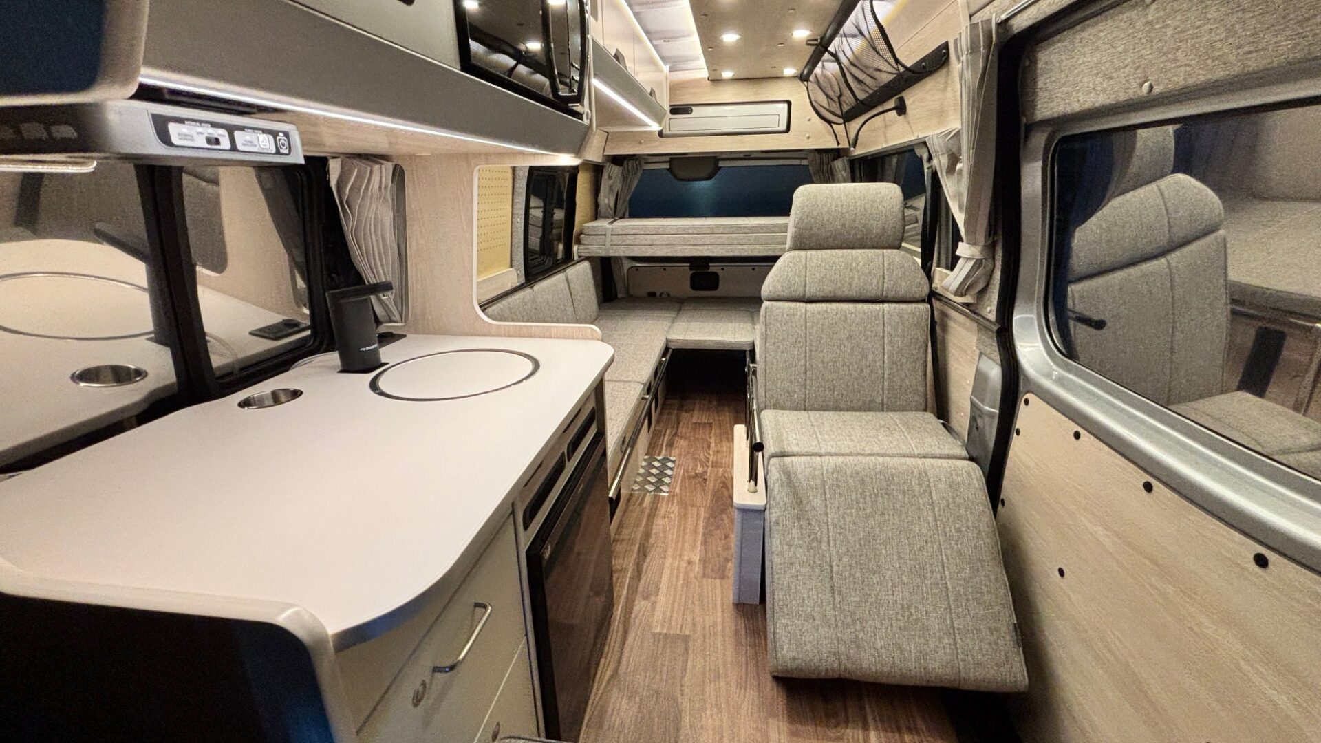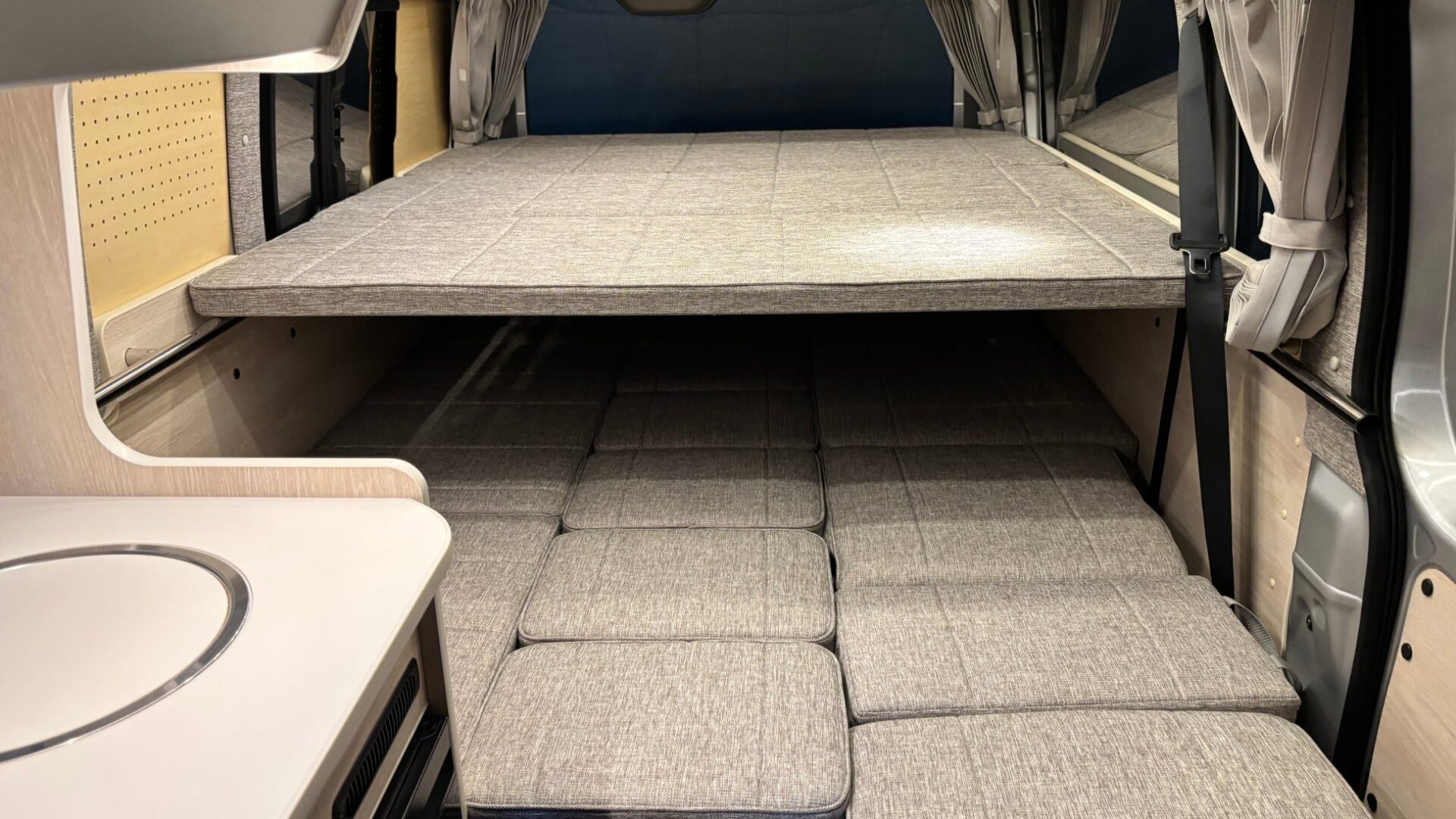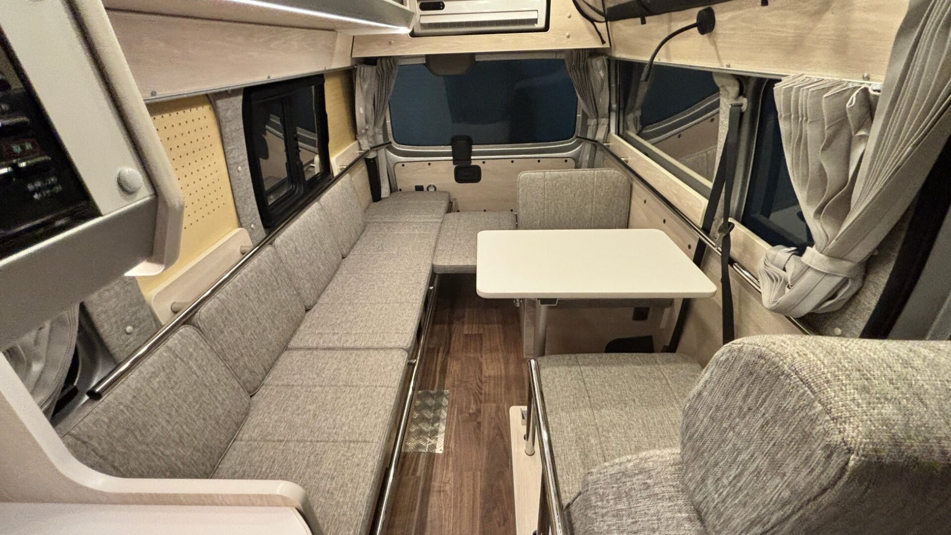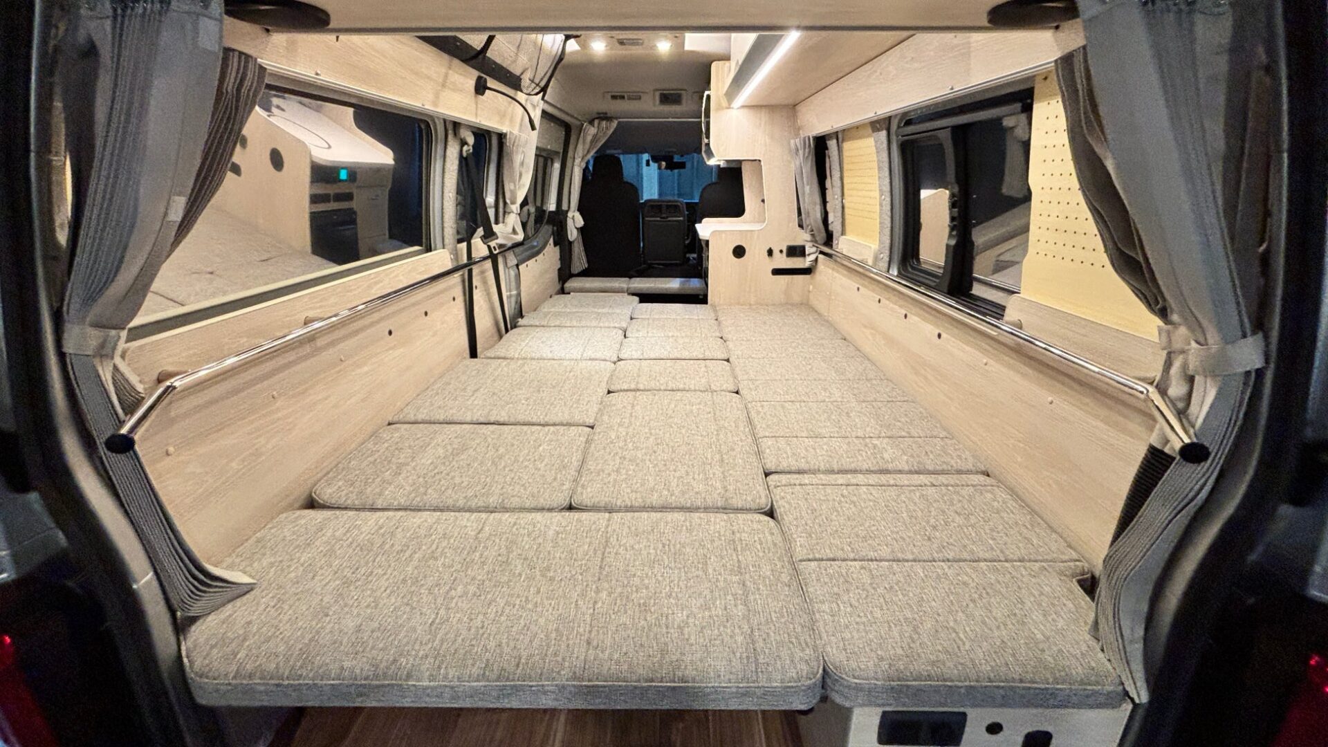 ライトグレーを基調にした北欧風デザインの内装は、柔らかく落ち着いた雰囲気。3人掛け横向きシートと1人掛けマルチシートを備え、ダイネット・フラットベッド・就寝スペースへの変形もスムーズです。ベッド展開時は2300mm×1500mmの広さを確保し、大人2人と子ども1人がゆったり就寝できます。