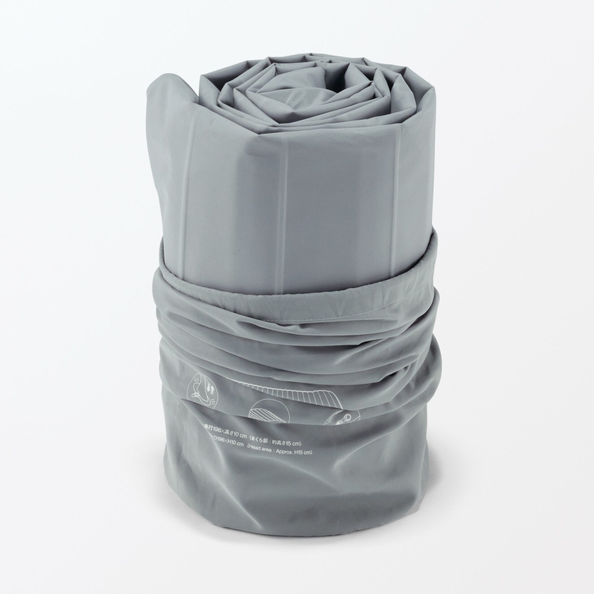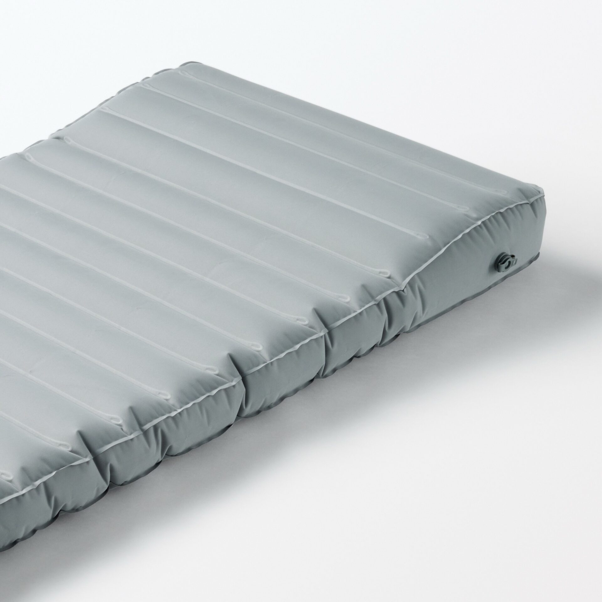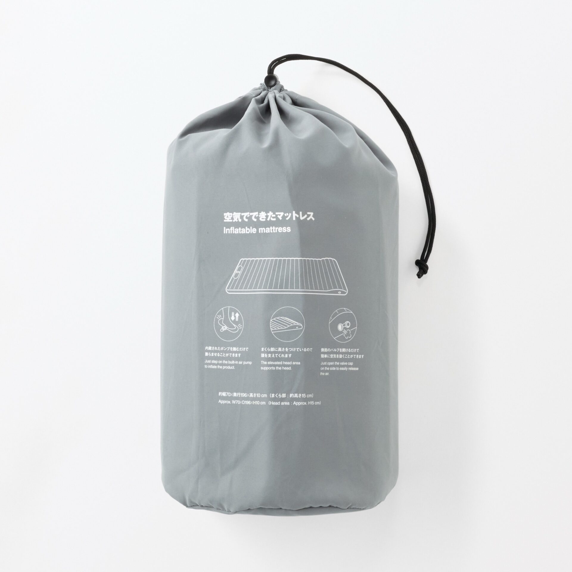 無印良品の空気でできたマットレスは、空気を入れて膨らませるタイプのマットレスだ。サイズは幅約70cm、長さ約196cm、高さ約10cm。頭部には約15cmの厚みがあり、枕を一体化した設計になっている。