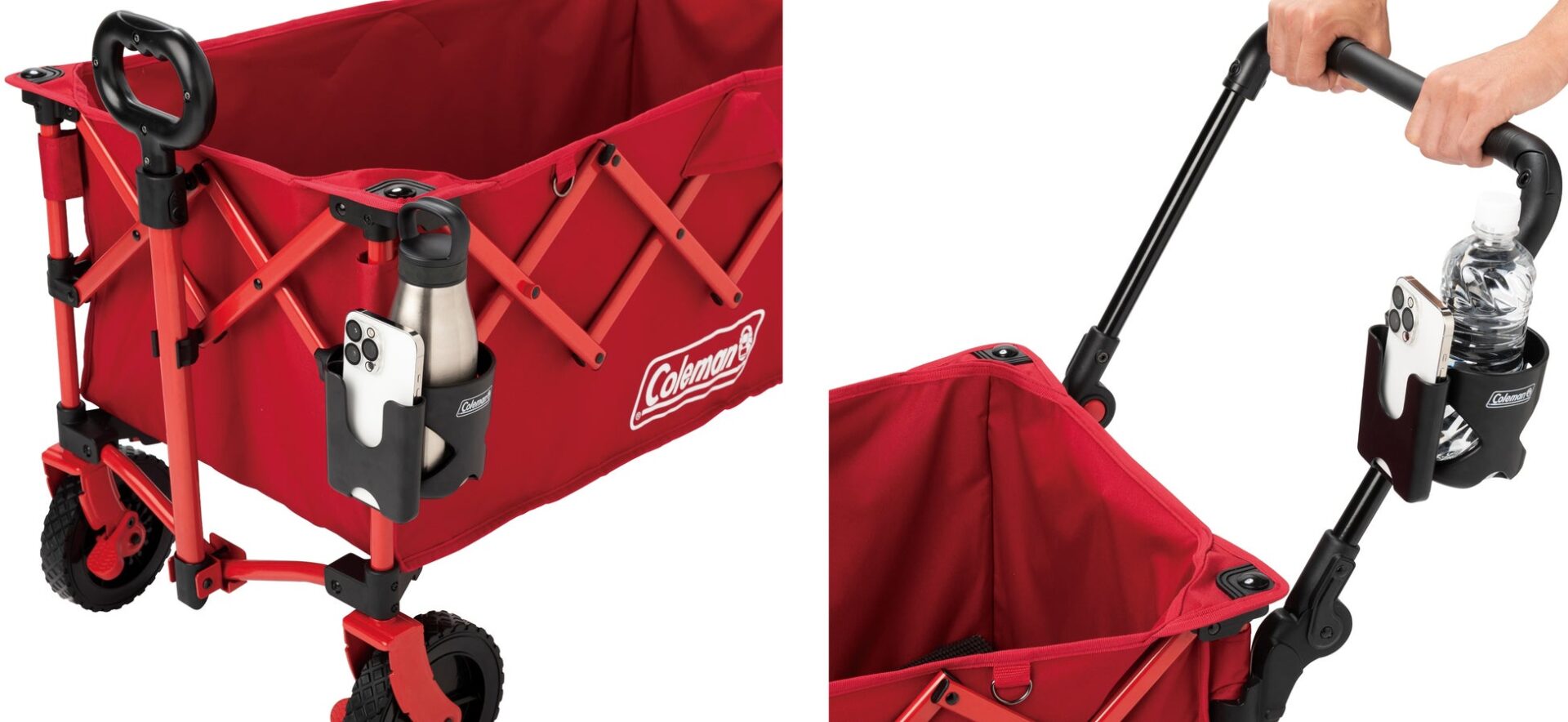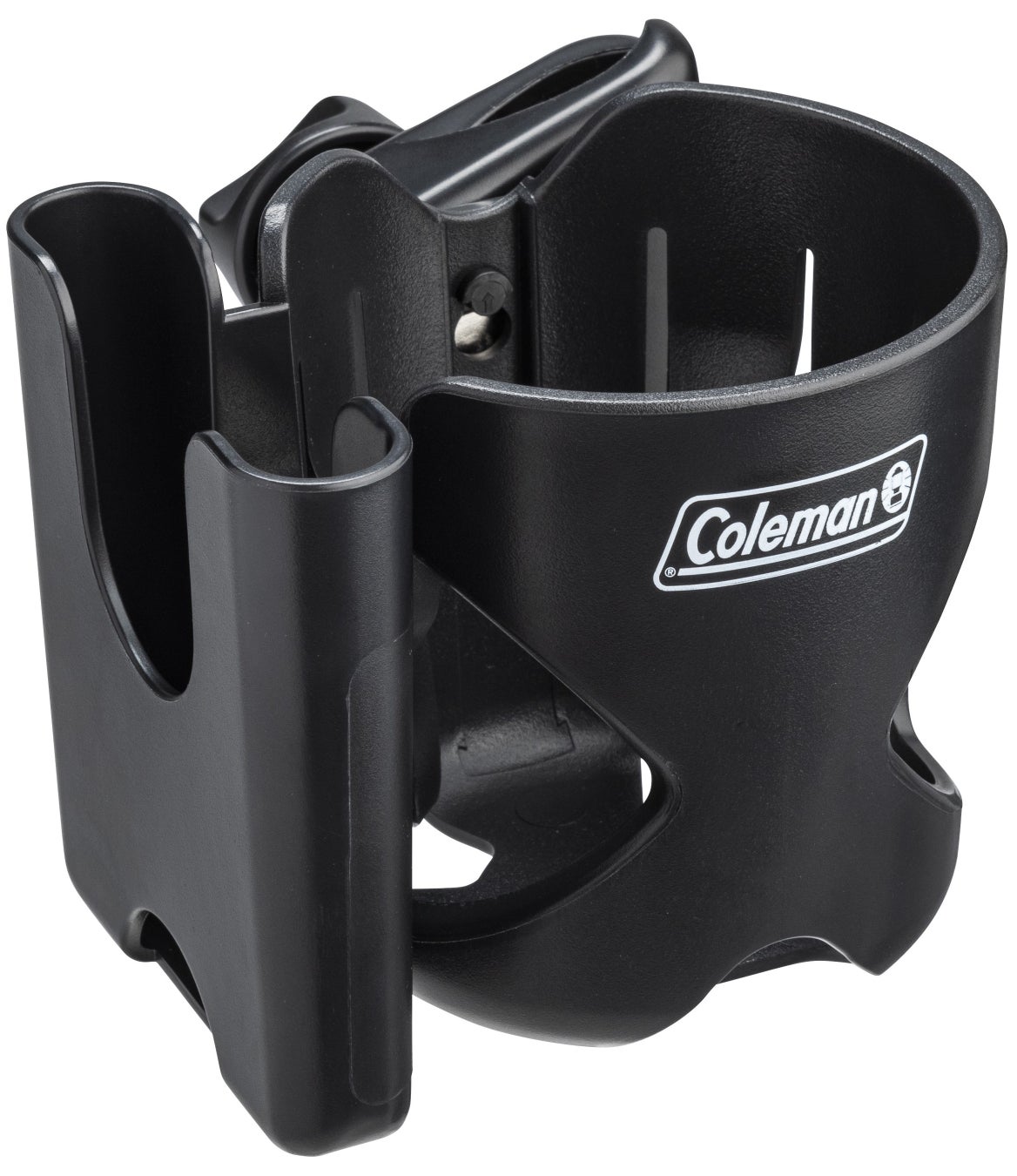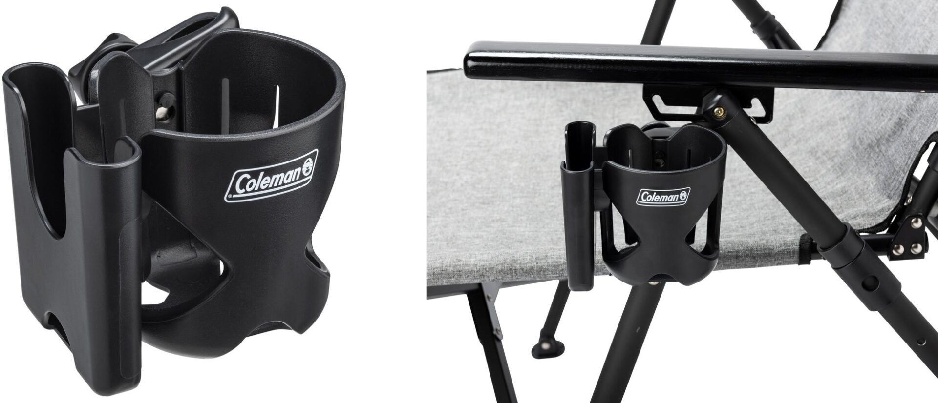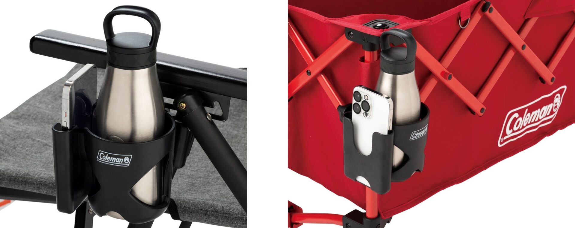コールマン カップホルダーは、ボトルだけでなくスマートフォンも収納できる設計。焚き火のそばでも、チェア横に定位置があるだけで安心感が違います。