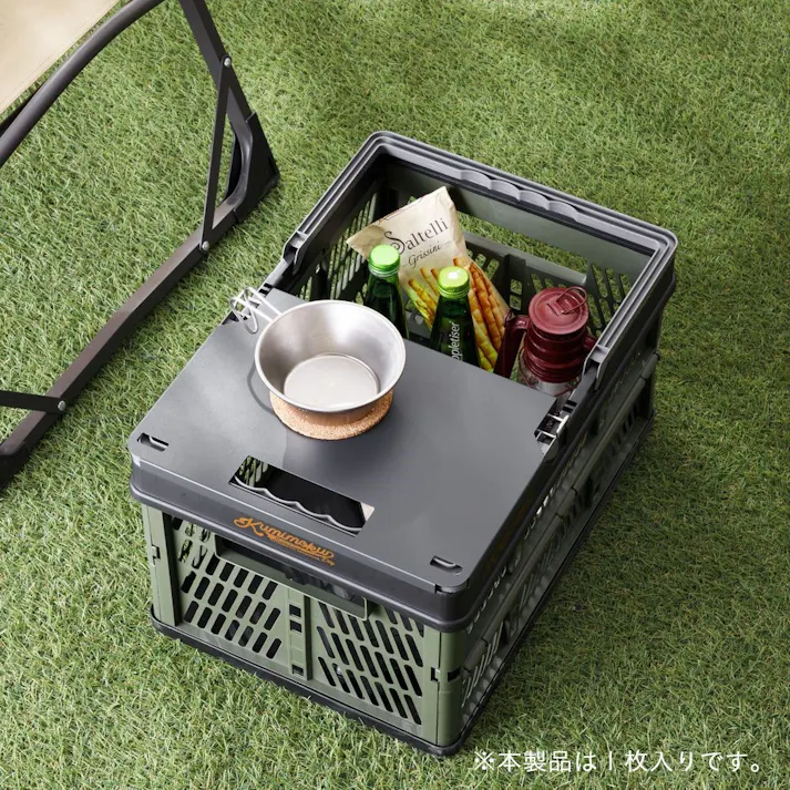 それに加えて、このコンテナ専用の“後付け天板”がキモ。別売りの「有孔タイプのトレーテーブル(500円台)」を2枚セットすれば、なんとテーブルにも早変わり。これはソロキャンプや車内調理にも活用できる構造です。