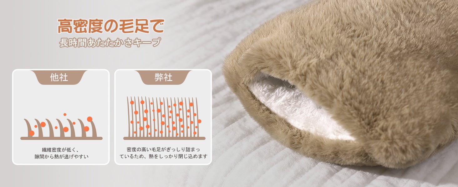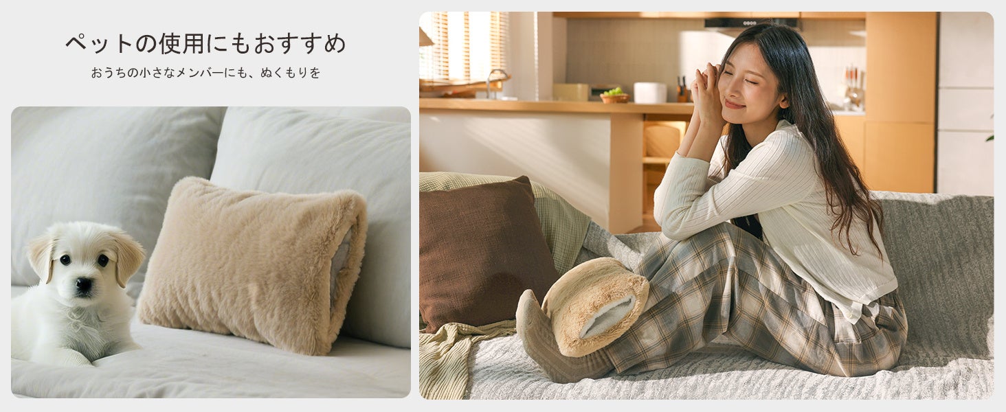 まるでウサギの毛並みのような柔らかいカバー付き。手を差し込めるポケット付きで、冷えやすい指先までしっかり温めます。ソファやベッドでも快適に使えます。