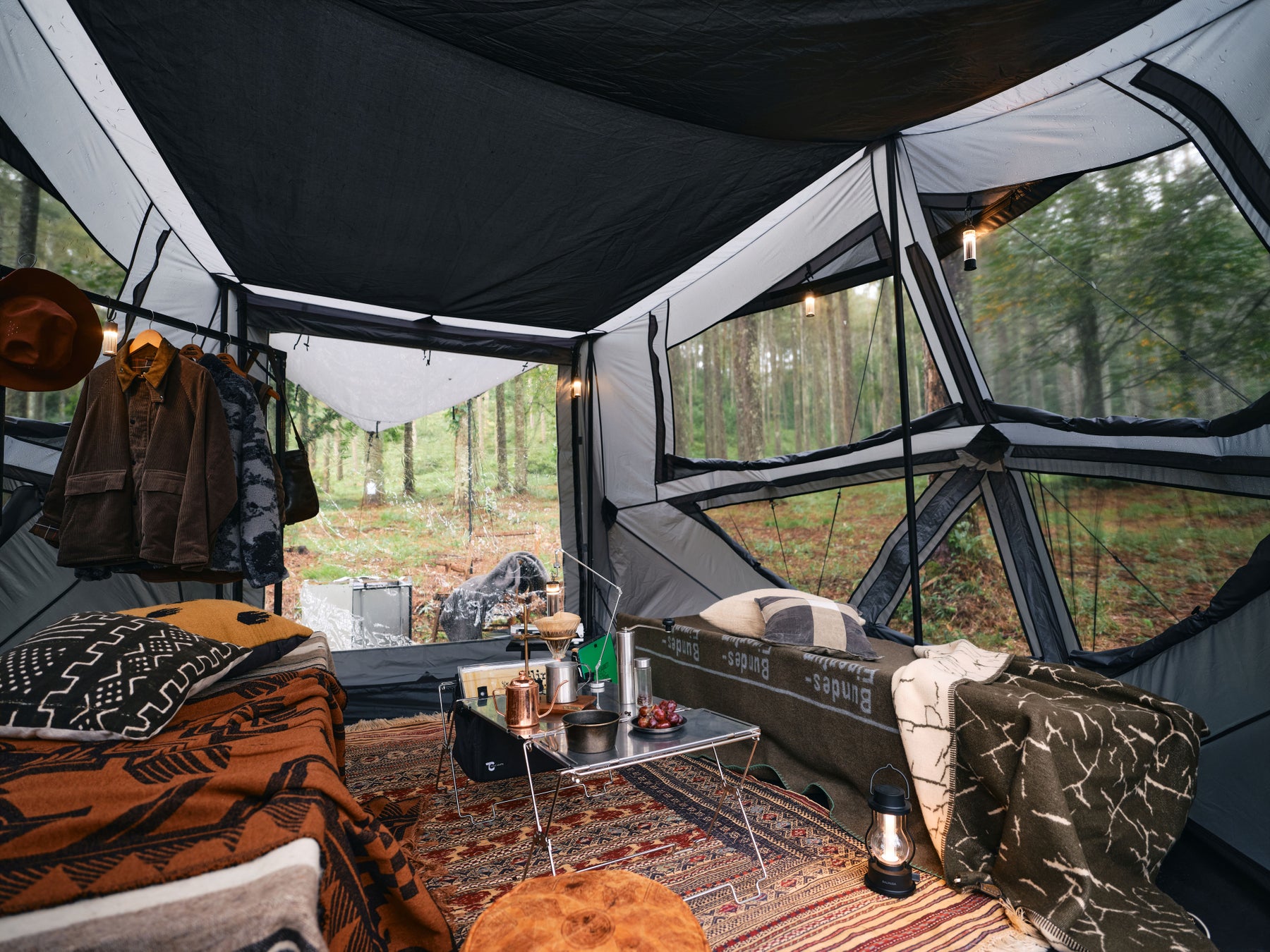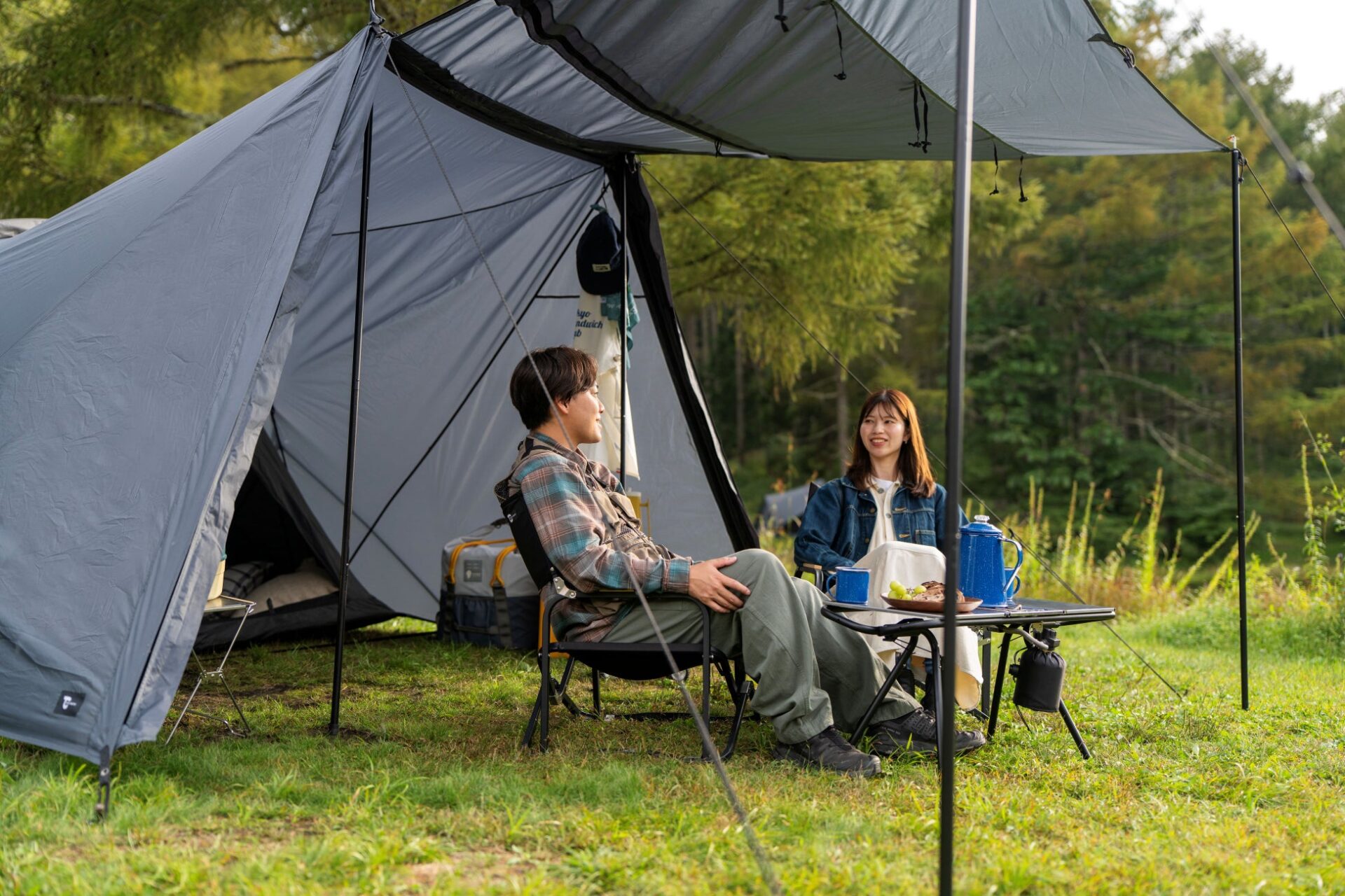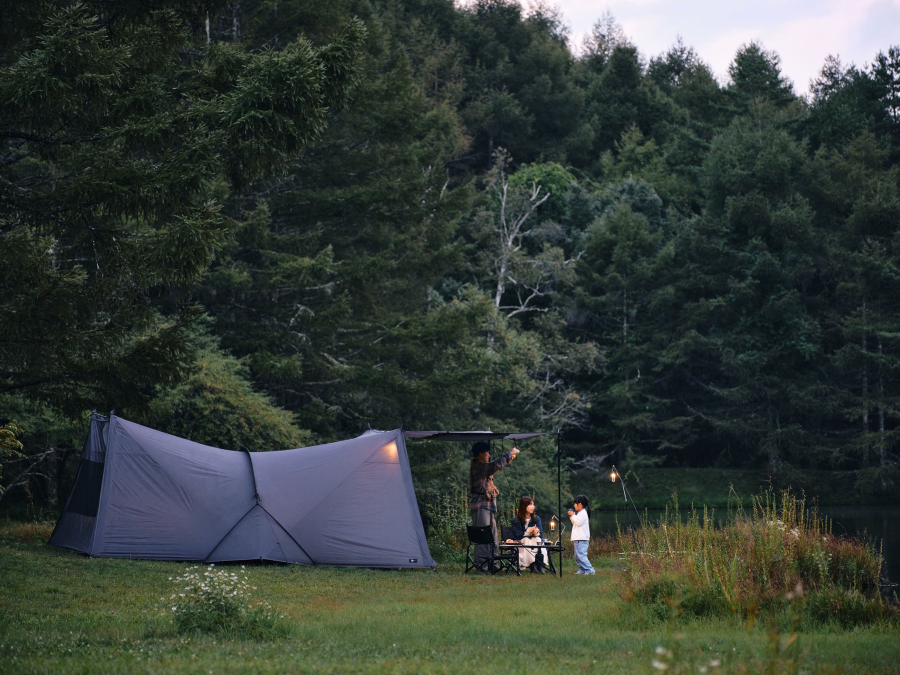 「オルターフォート」はテントとタープを両立できる“オールインワン型”の新提案。ツールームテント、シェルター、タープとシーンに応じた使い分けが可能で、2〜4人程度に適したサイズ感です。ドアパネルを立てれば前室が広がり、開放的なリビング空間を確保できます。