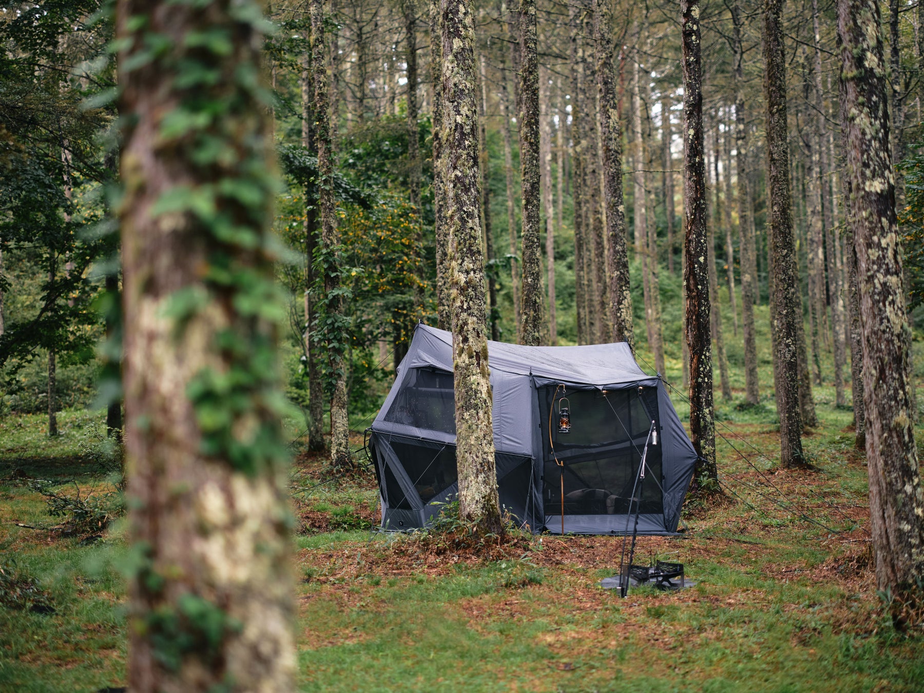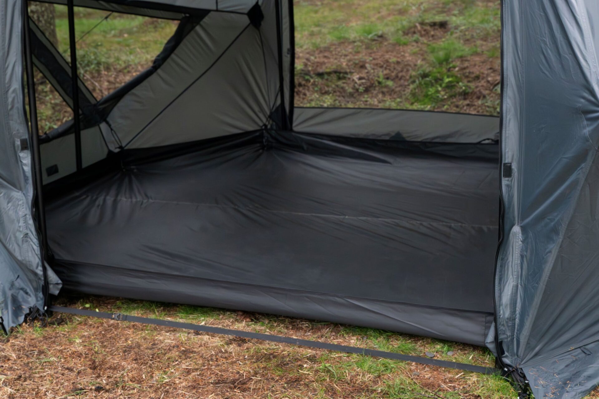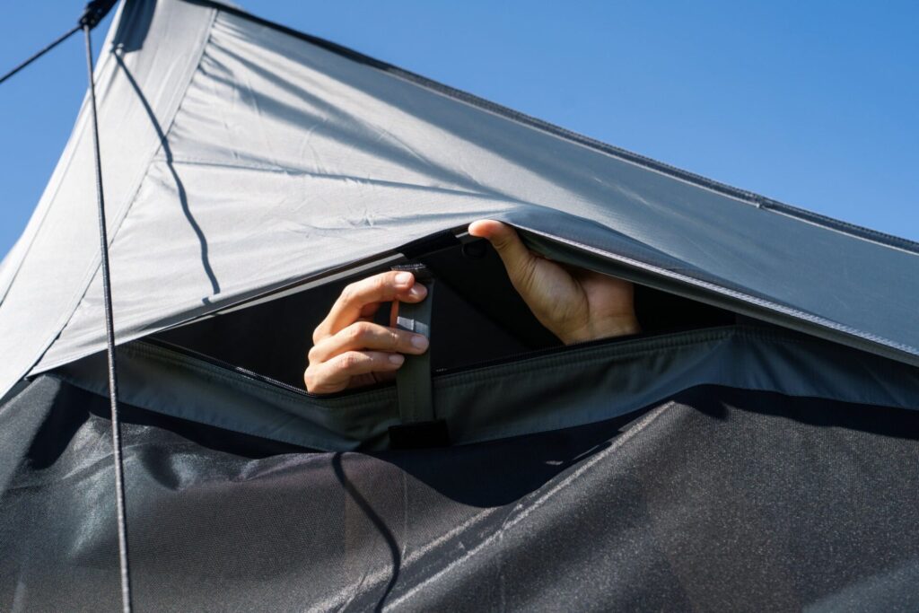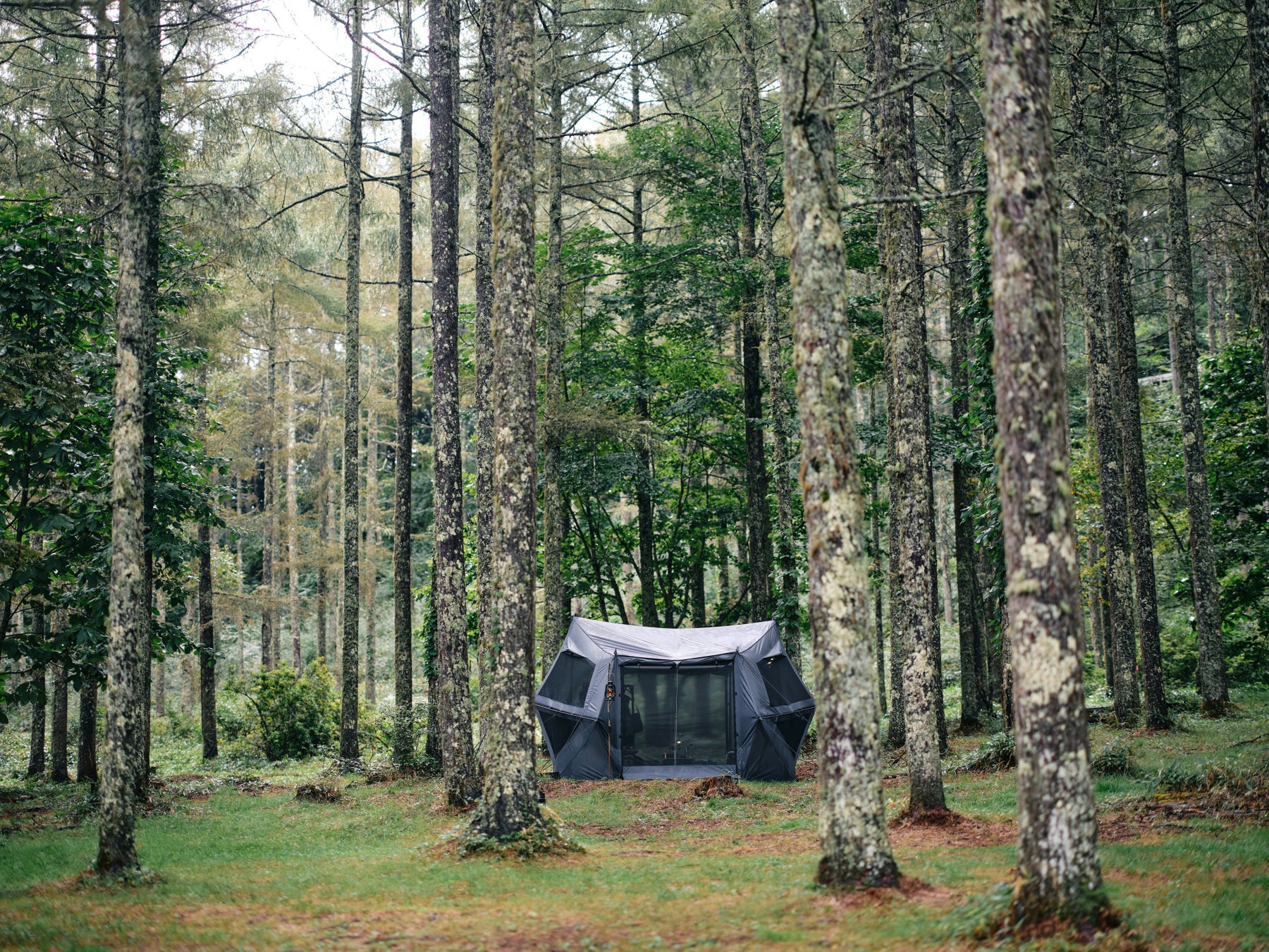 「オルターフォート」はテントとタープを両立できる“オールインワン型”の新提案。ツールームテント、シェルター、タープとシーンに応じた使い分けが可能で、2〜4人程度に適したサイズ感です。ドアパネルを立てれば前室が広がり、開放的なリビング空間を確保できます。