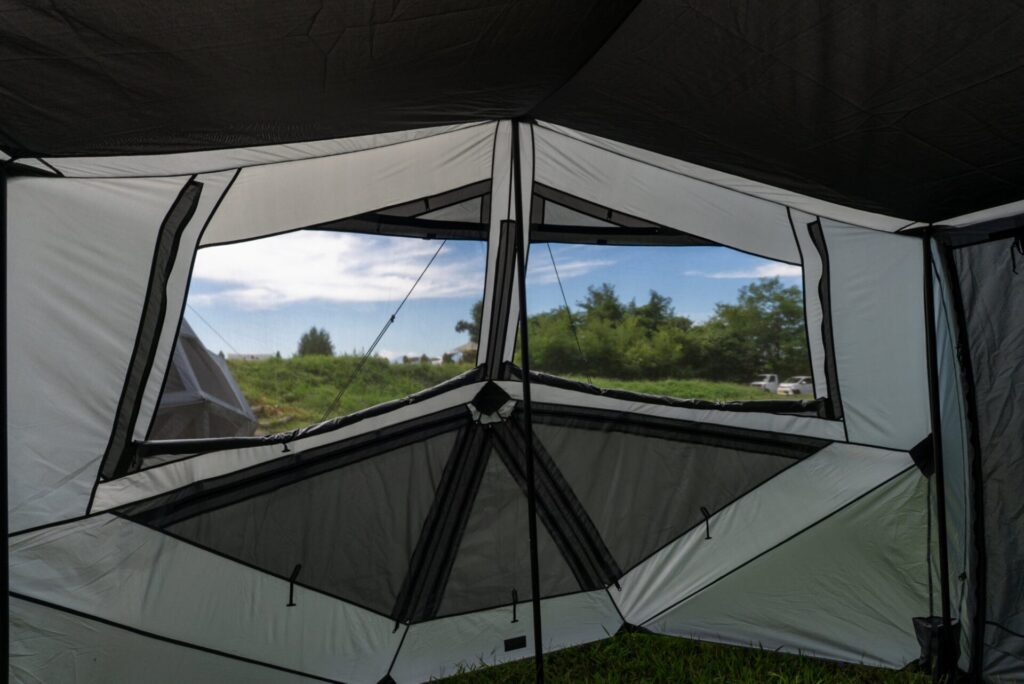広々とした空間と独特なフォルムで人気を集めた「グラハス」を、一回り小型化したのが「グラハス M」。床面積を抑えつつも高さは240cmと十分で、成人が立って過ごせる余裕があります。2〜4人の少人数キャンプにぴったりのサイズ感で、デザイン性と実用性を兼ね備えています。